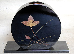 木製・漆塗り・手描き蒔絵商品です。 気軽にお花が楽しめる、背の低い小さめの花生けです。