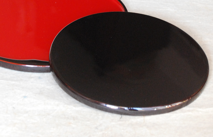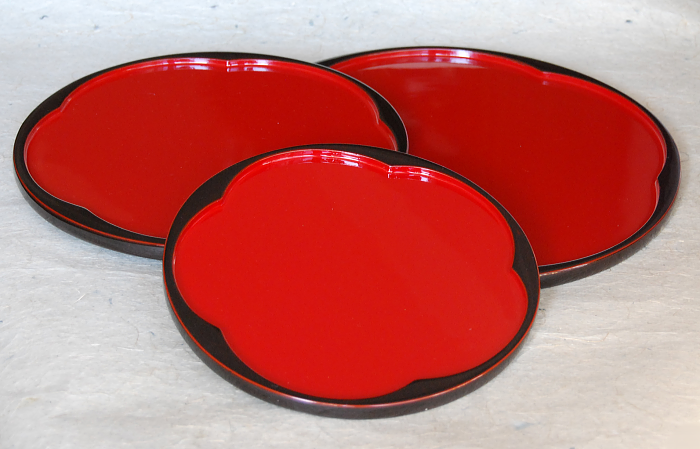 木製のお盆を漆塗りで仕上げてあります (サイズ φ19、φ24、φ30 高さ1.5p)
