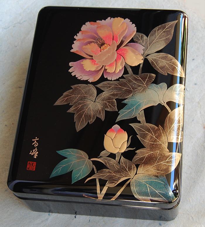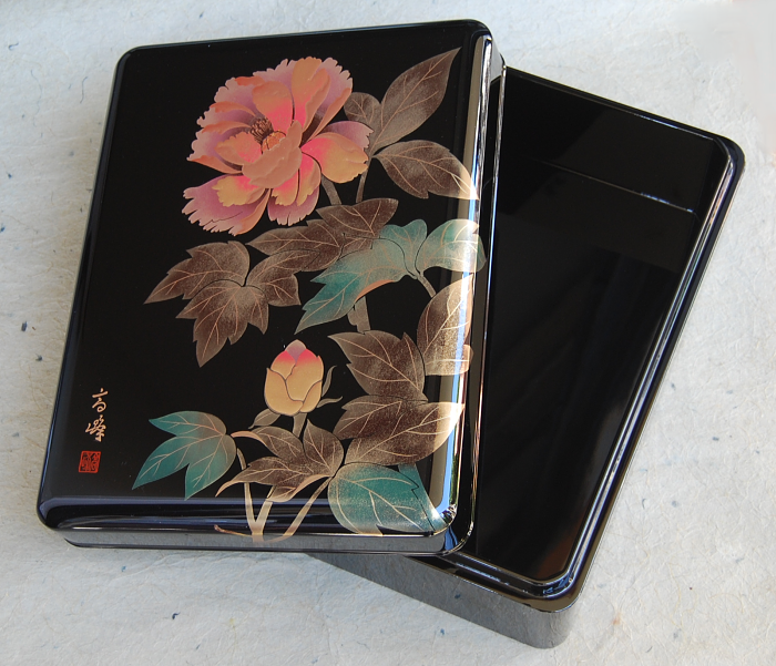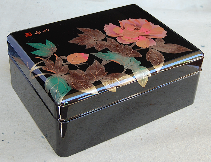 (黒)11.0玉渕付合口文箱 手描き蒔絵「牡丹」 A4対応 木製/カシュー